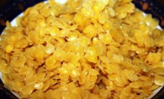 Необходимо предварительно отварить до полуготовности чечевицу. Для контрастного цвета лучше всего взять желтую или красную чечевицу. Отварить ее в подсоленной воде минут 10, затем откинуть на дуршлаг, промыть холодной водой и дать подсохнуть.