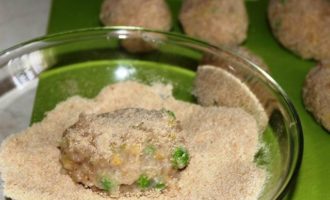 Из фарша сделать небольшие продолговатые котлетки и обвалять их в панировочных сухарях (вместо сухарей можно использовать и кукурузную муку… получится красивый золотистый цвет).