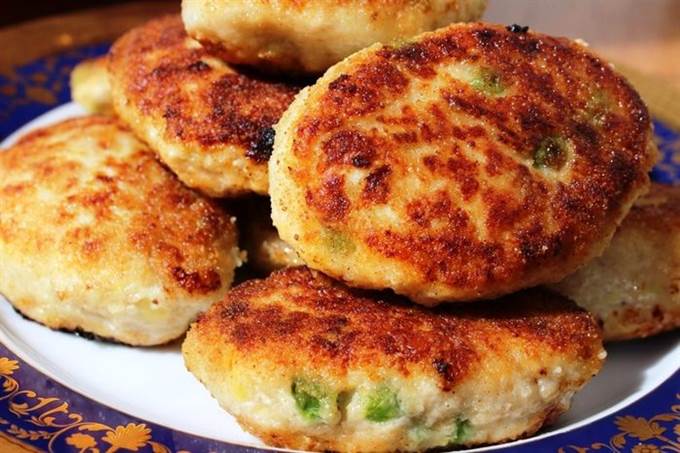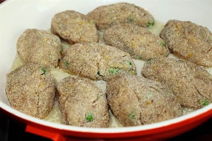 Из фарша сделать небольшие продолговатые котлетки и обвалять их в панировочных сухарях (вместо сухарей можно использовать и кукурузную муку… получится красивый золотистый цвет).