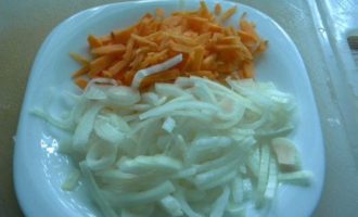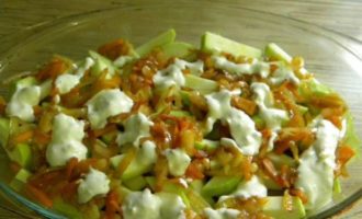 • Поджариваем морковь и лук и вылажеваем сверху кабачка, потом заливаем сметаной.