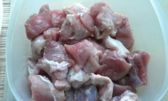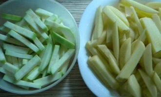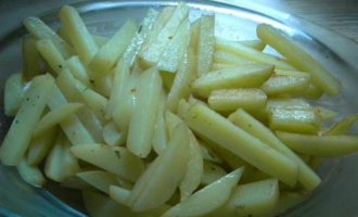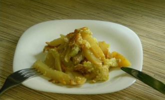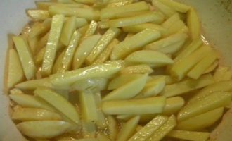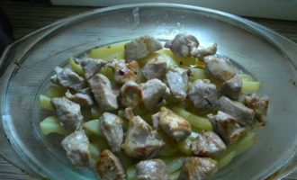 • Поджареную картошку кладем в форму, и поджариваем мясо.