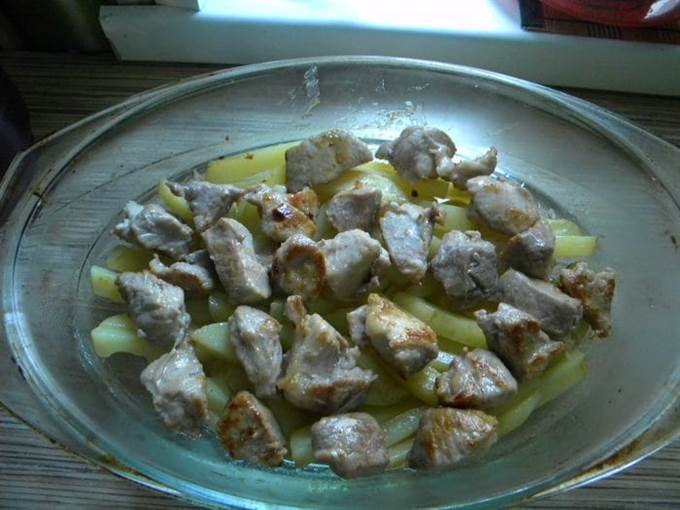 • Поджареную картошку кладем в форму, и поджариваем мясо.