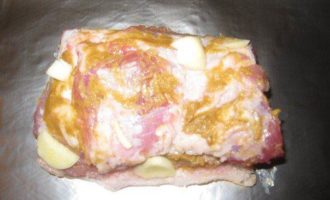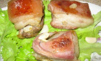 Обмазываем горчицей. Нашпиговываем чесноком.