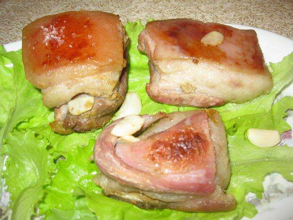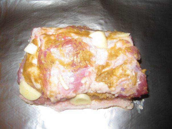 Обмазываем горчицей. Нашпиговываем чесноком.
