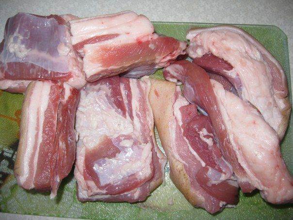 Свежее сало моем и режем его на небольшие куски. Хорошенько натираем солью, специями.