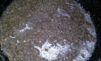 • В раскаленном масле слегка пассеруем лук, добавляем фарш и обжариваем. Солим, перчим, добавляем мелко порезанный чеснок, обжариваем еще несколько минут и доливаем немного воды, тушим, пока вода не выпарится.