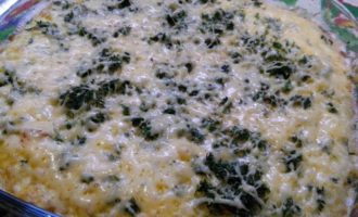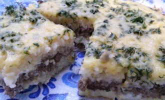 • Форму слегка смазать маслом, отправить разогреться в духовку на несколько минут, достаем и заливаем половину порции яиц с молоком и рисом и отправляем в духовку на 3 минуты, чтобы омлет «схватился». Достаем и выкладываем сверху фарш, а сверху заливаем оставшейся порцией яиц, молока и риса. И выпекаем около 20 минут. Достаем и посыпаем мелко порезанным укропом.
