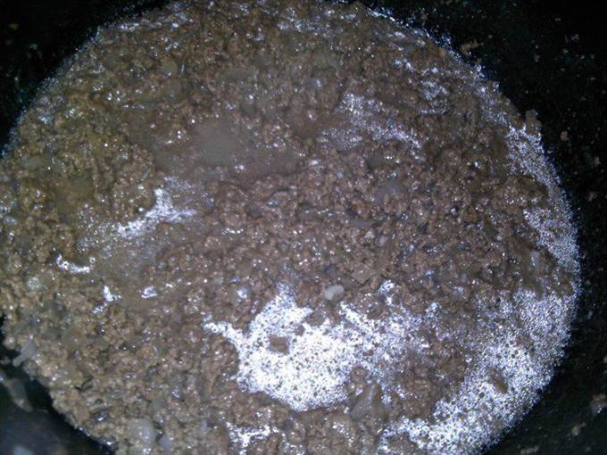 • В раскаленном масле слегка пассеруем лук, добавляем фарш и обжариваем. Солим, перчим, добавляем мелко порезанный чеснок, обжариваем еще несколько минут и доливаем немного воды, тушим, пока вода не выпарится.