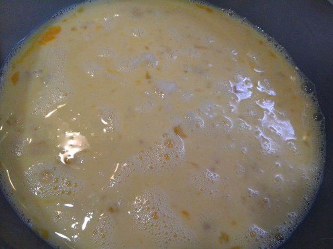 Яйца смешать с молоком, посолить, взбить венчиком. Добавить рис.