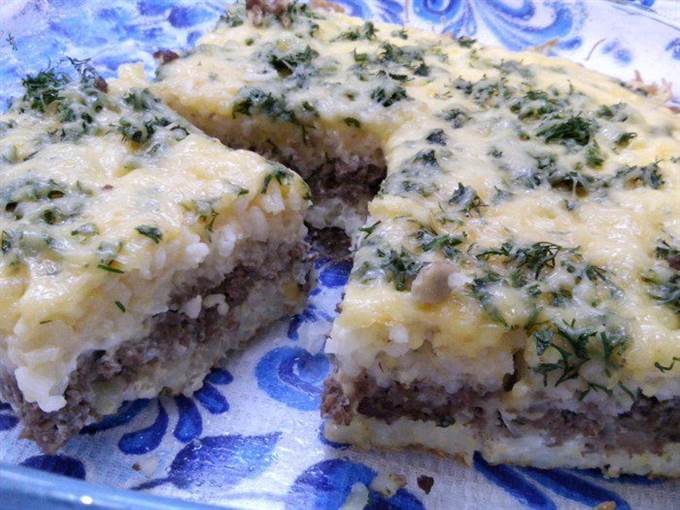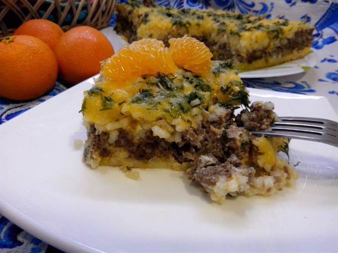 • Форму слегка смазать маслом, отправить разогреться в духовку на несколько минут, достаем и заливаем половину порции яиц с молоком и рисом и отправляем в духовку на 3 минуты, чтобы омлет «схватился». Достаем и выкладываем сверху фарш, а сверху заливаем оставшейся порцией яиц, молока и риса. И выпекаем около 20 минут. Достаем и посыпаем мелко порезанным укропом.