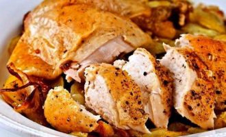 Нарезать порционно цыпленка, уложить на сервировочное блюдо, по кругу выложить запеченные овощи и подавать на стол! Приятного аппетита!