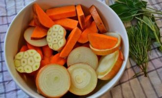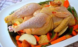 Цыпленка достать из холодильника за 30 минут до начала приготовления. Затем включить духовку на 240 С. Овощи мы не будем чистить, а только как следует вымоем и нарежем крупными кусками (дольками, кружочками, брусочками, как Вам будет угодно…) Головку чеснока тоже вымыть и разрезать поперек пополам… Вымыть и высушить ароматные травки. В принципе, набор овощей у Вас может быть любой, подходящий Вам по вкусу!) Выложить овощи слоем в форму для запекания — противень с высокими бортами (предварительно сбрызнуть дно оливковым маслом). Посолить и поперчить.