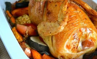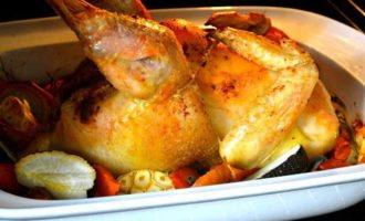 Поставить форму с цыпленком в духовку и сразу же понизить температуру духовки до 200 С. Выпекать от 1,5 ч и может быть чуть больше (до 2-х ч)… все зависит от размеров Вашего цыпленка (курицы). Проверить готовность можно, воткнув в мякоть кончик ножа…, выделяющийся из цыпленка сок должен быть светлого цвета, без крови.