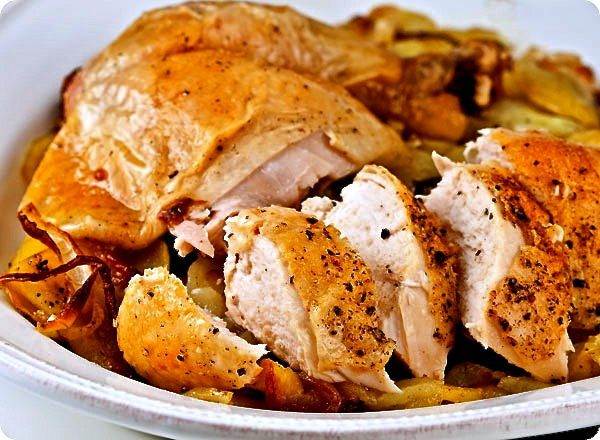 Нарезать порционно цыпленка, уложить на сервировочное блюдо, по кругу выложить запеченные овощи и подавать на стол! Приятного аппетита!