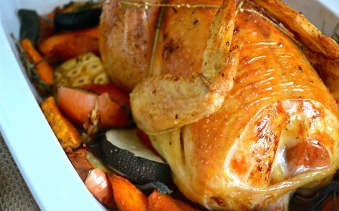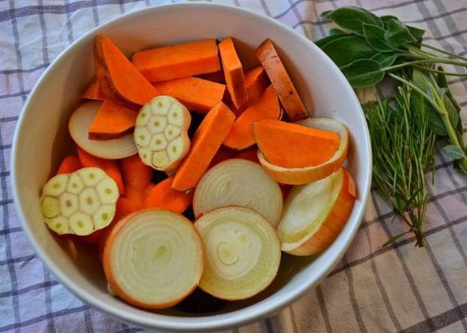 Цыпленка достать из холодильника за 30 минут до начала приготовления. Затем включить духовку на 240 С. Овощи мы не будем чистить, а только как следует вымоем и нарежем крупными кусками (дольками, кружочками, брусочками, как Вам будет угодно…) Головку чеснока тоже вымыть и разрезать поперек пополам… Вымыть и высушить ароматные травки. В принципе, набор овощей у Вас может быть любой, подходящий Вам по вкусу!) Выложить овощи слоем в форму для запекания — противень с высокими бортами (предварительно сбрызнуть дно оливковым маслом). Посолить и поперчить.