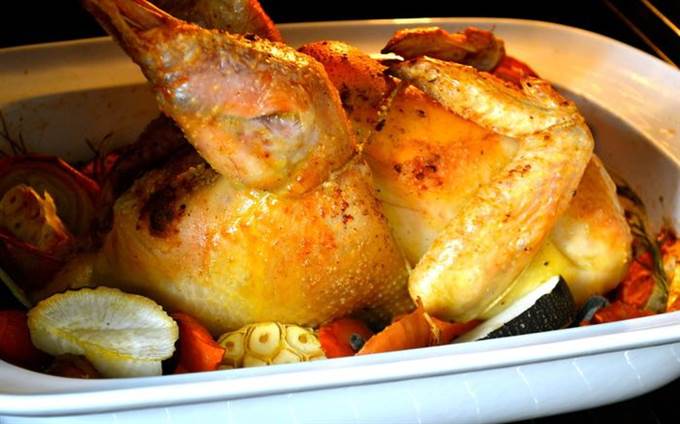 Поставить форму с цыпленком в духовку и сразу же понизить температуру духовки до 200 С. Выпекать от 1,5 ч и может быть чуть больше (до 2-х ч)… все зависит от размеров Вашего цыпленка (курицы). Проверить готовность можно, воткнув в мякоть кончик ножа…, выделяющийся из цыпленка сок должен быть светлого цвета, без крови.