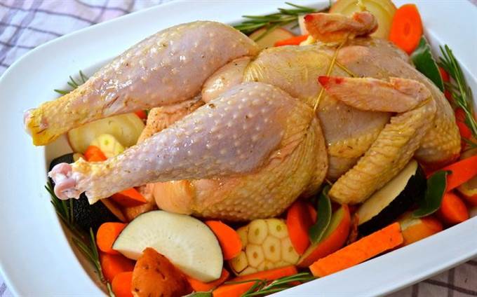 Цыпленка вымыть, обсушить бумажным полотенцем и натереть солью с перцем. Лимон наколоть вилкой (или ножом) и вложить в полость тушки цыпленка. Подготовленную птицу выложить на слой овощей. Добавить букет ароматных травок по кругу, можно добавить немного внутрь тушки вместе с лимоном. Цыпленка можно смазать немного мягким сливочным масло для придания цыпленку более золотистой корочки, или сбрызнуть оливковым маслом.