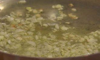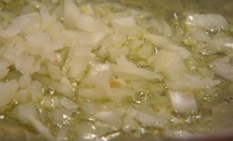 Разогреть в сковороде оливковое масло и обжарить лук до прозрачности.