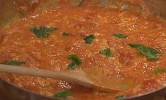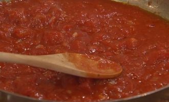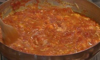 Добавить в сковороду помидоры из банки, посолить, поперчить, перемешать и потомить несколько минут на медленном огне.