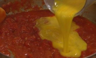 Яйца слегка взбить, посолить, поперчить и вылить в сковороду с луком и помидорами.