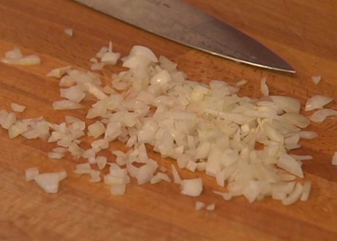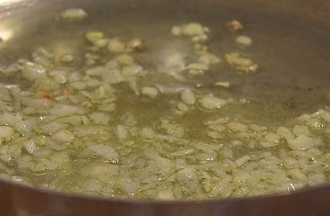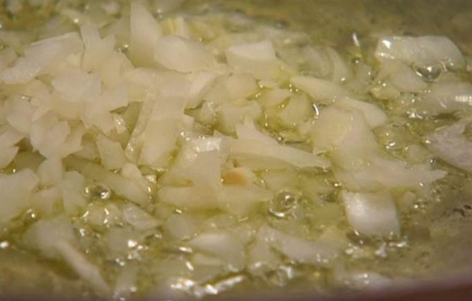 Разогреть в сковороде оливковое масло и обжарить лук до прозрачности.