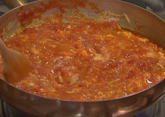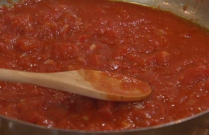Добавить в сковороду помидоры из банки, посолить, поперчить, перемешать и потомить несколько минут на медленном огне.