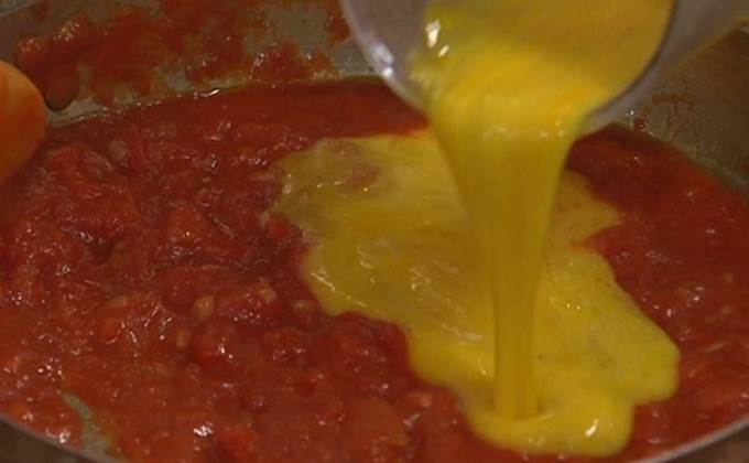 Яйца слегка взбить, посолить, поперчить и вылить в сковороду с луком и помидорами.