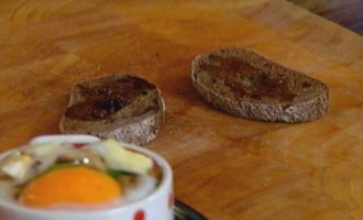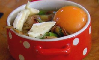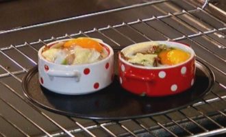 • В две небольшие керамические формы выложить половину сыра, затем обжаренные грибы с беконом и луком, разбить по 1 яйцу так, чтобы желток не растекся, сверху разложить оставшийся сыр.