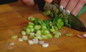 • Лук мелко порубить и добавить в сковороду, посолить, поперчить и обжарить еще немного.
