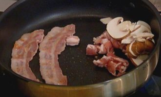 • В сковороду с беконом добавить нарезанные бекон и грибы и обжарить все до золотистого цвета. Обжаренные целые полоски бекона выложить на бумажное полотенце, чтобы убрать излишки жира.
