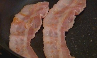 Разогреть сковороду и слегка обжарить половину бекона.