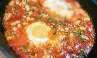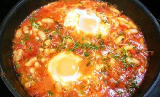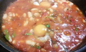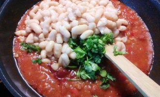 Солим, перчим и добавляем сахар по вкусу. Промываем фасоль под проточной водой и добавляем фасоль к томатном соусу. Прогреваем и добавляем петрушку.