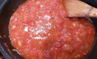 Итак пассеруем нарезанный лук и чеснок до прозрачности, добавляем рубленный перец чили (остроту регулируйте по своему вкусу) и измельченные помидоры, тушим под крышкой приблизительно 15 мин.