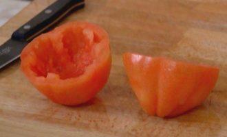 • Помидор разрезать поперек пополам, ложкой вынуть сердцевину.