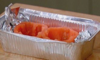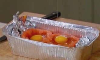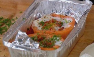 • Помидорные чашечки поместить в небольшую форму для выпечки срезами вверх, чтобы половинки помидоров стояли прямо (если нужно, смять фольгу и подложить под бока).