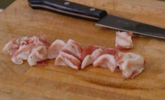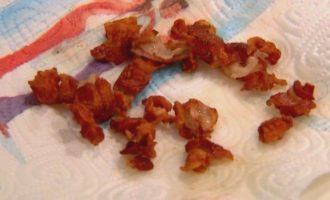 • Разогреть в сковороде оливковое масло и обжарить бекон до золотистого цвета, затем выложить на бумажное полотенце, чтобы убрать излишки жира.