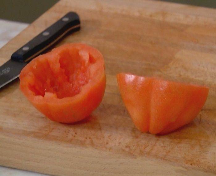 • Помидор разрезать поперек пополам, ложкой вынуть сердцевину.