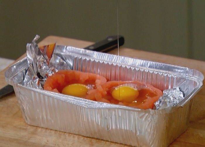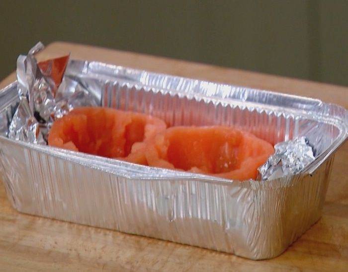 • Помидорные чашечки поместить в небольшую форму для выпечки срезами вверх, чтобы половинки помидоров стояли прямо (если нужно, смять фольгу и подложить под бока).