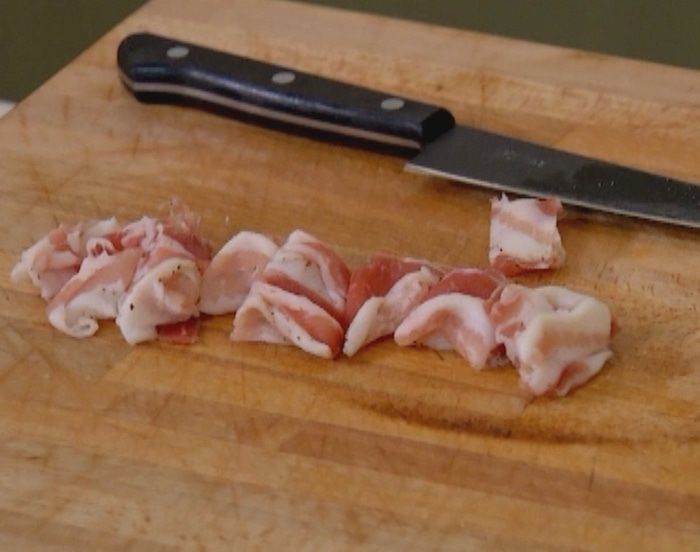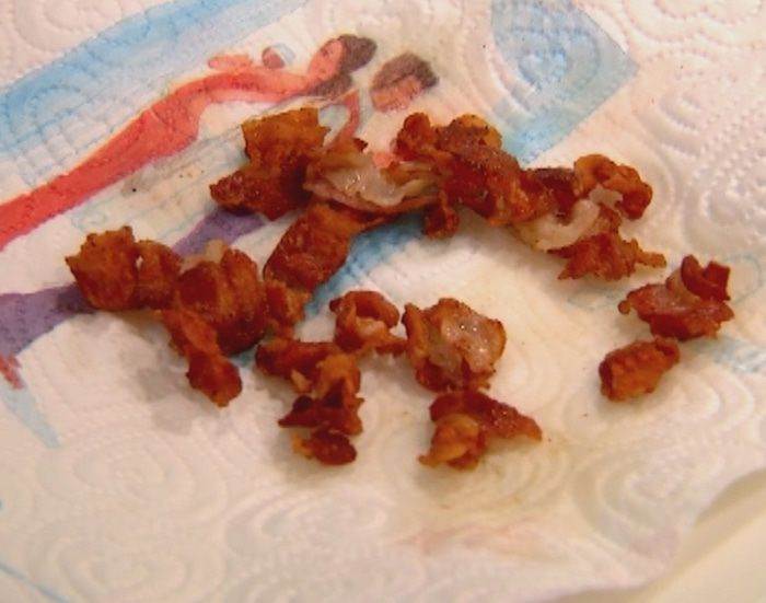 • Разогреть в сковороде оливковое масло и обжарить бекон до золотистого цвета, затем выложить на бумажное полотенце, чтобы убрать излишки жира.