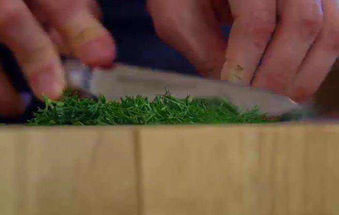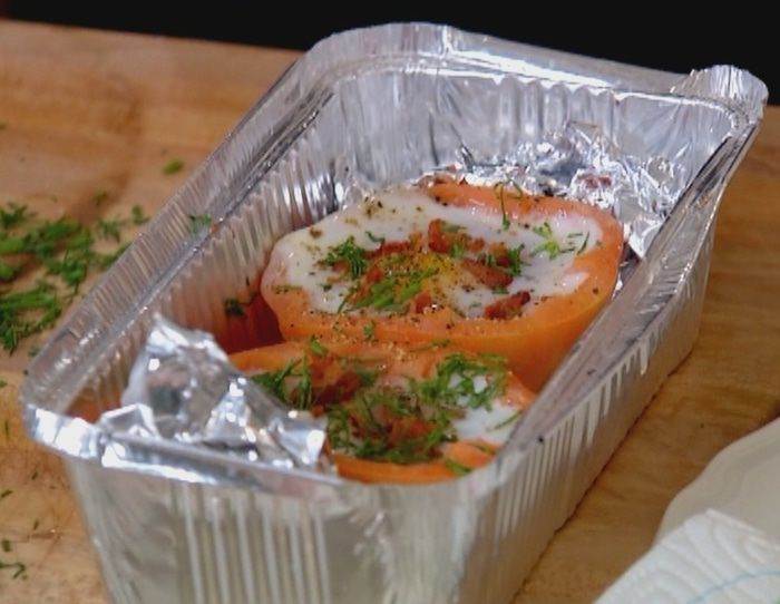 • Укроп мелко порубить. На запеченные яйца в помидорах выложить бекон и посыпать зеленью.