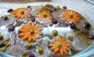 Как только бульон «схватился», застыл, достаем форму из холодильника, выкладываем сверху цветки из моркови и опять заливаем небольшим количеством бульона.