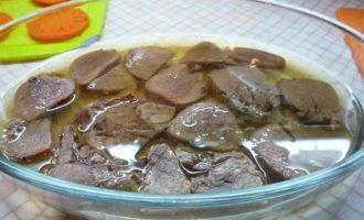 На дно формы выкладываем нарезанные дольками языки, аккуратно заливаем небольшим количеством бульона и убираем в холодильник.
