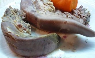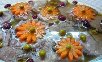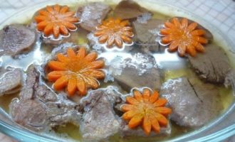 Бульон процеживаем и оставляем охлаждаться. Языки еще горячими очищаем от кожи и нарезаем тонкими дольками. Морковь нарезаем пластинками или кубиками (я использовала вырубки для мастики). Желатин заливаем небольшим количеством бульона, даем настояться 40 минут, затем распускаем на водяной бане и смешиваем с остальным бульоном.