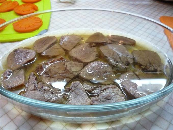 На дно формы выкладываем нарезанные дольками языки, аккуратно заливаем небольшим количеством бульона и убираем в холодильник.