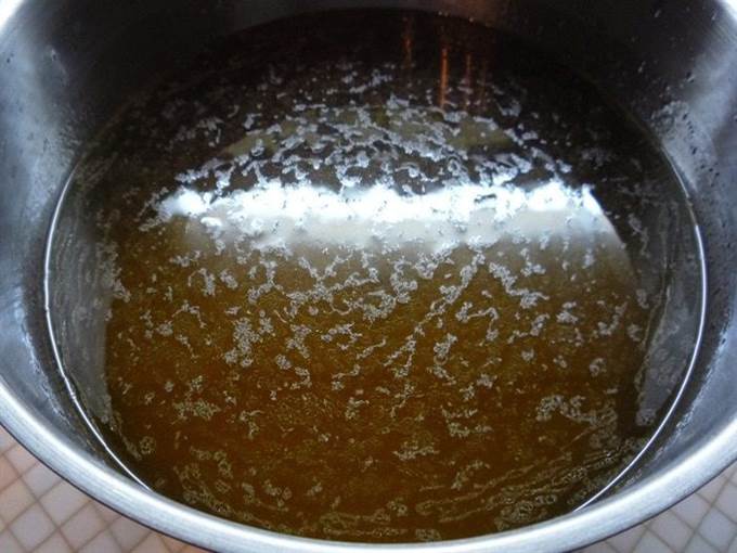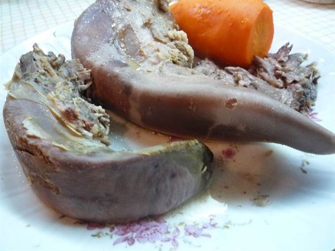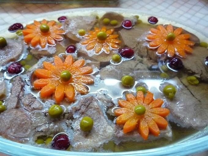 Бульон процеживаем и оставляем охлаждаться. Языки еще горячими очищаем от кожи и нарезаем тонкими дольками. Морковь нарезаем пластинками или кубиками (я использовала вырубки для мастики). Желатин заливаем небольшим количеством бульона, даем настояться 40 минут, затем распускаем на водяной бане и смешиваем с остальным бульоном.