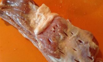 Грудинку хорошо вымыть и обсушить бумажным полотенцем (еще можно «потыкать» в нее ножом).
