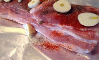 Натереть солью, перцем. Нарезать чеснок и разложить на кусок грудинки.
