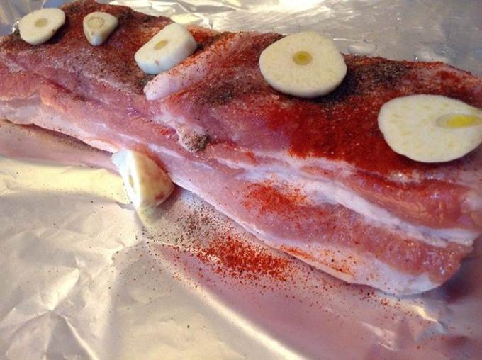 Натереть солью, перцем. Нарезать чеснок и разложить на кусок грудинки.