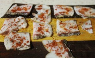Сало порезать тонкими пластинками, посыпать сверху паприкой, перцем и солью.
