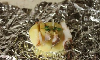 В разрезы картошки вставить по ломтику сала. Берем фольгу, на середину выкладываем по небольшому кусочку сливочного масла, сверху кладем картошечку, посыпаем травками и заворачиваем, как мешочек.